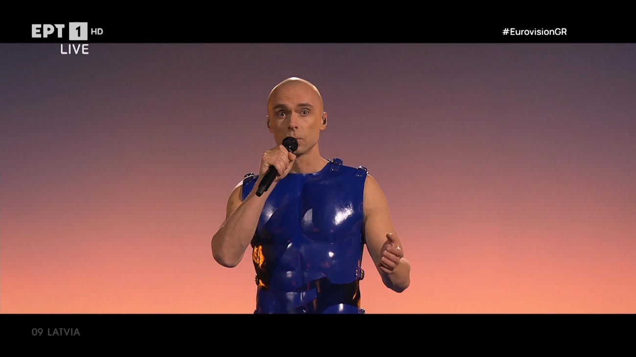 22.52: Μόνος στη σκηνή ο Λετονός και πίσω του ένας κύκλος. Τα στοιχήματα δίνουν τελευταία τη χώρα στον ημιτελικό, παρά τις άψογες φωνητικές δυνατότητες του Dons.
