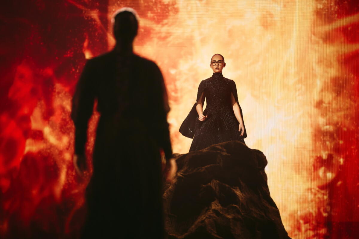 Το φόρεμα, με το οποίο εμφανίστηκε στην σκηνή, έχουν επιμεληθεί οι fashion designers Deux Hommes συνδυάζοντας στοιχεία της παράδοσης σε μία σύγχρονη απόδοση.