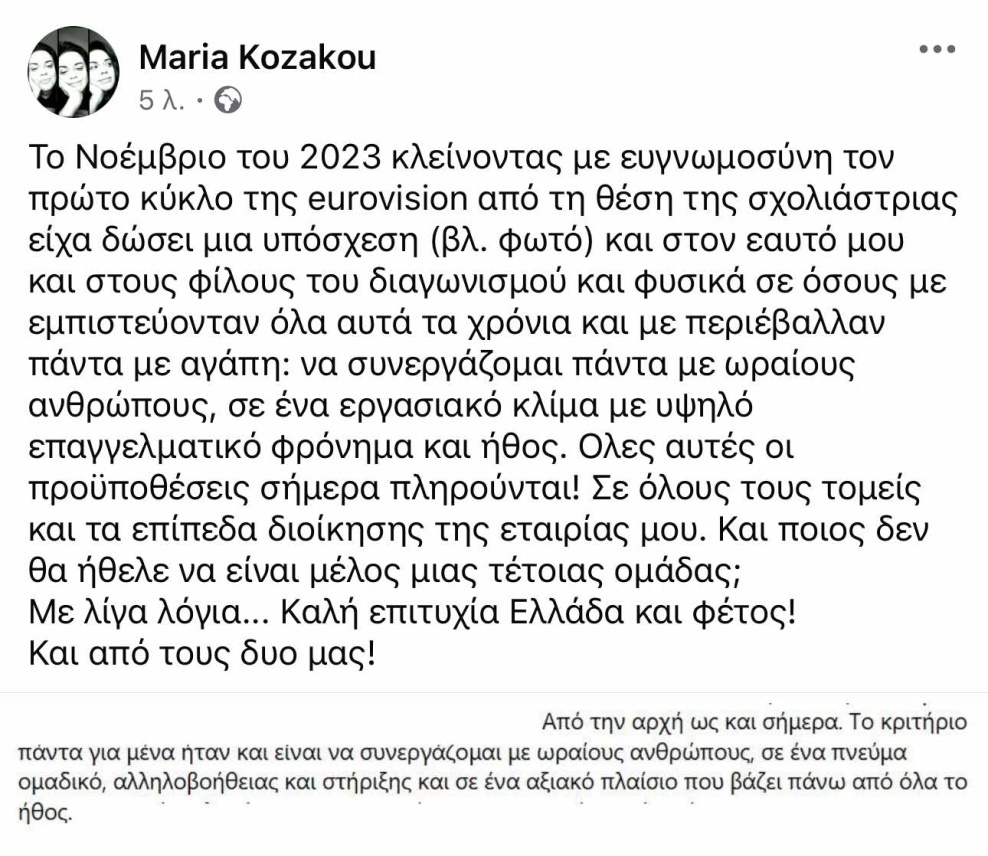 “Τον Νοέμβριο του 2023, κλείνοντας με ευγνωμοσύνη τον πρώτο κύκλο της Eurovision από τη θέση της σχολιάστριας, είχα δώσει μια υπόσχεση (βλ. φωτό) και στον εαυτό μου και στους φίλους του διαγωνισμού και φυσικά σε όσους με εμπιστεύονταν όλα αυτά τα χρόνια και με περιέβαλλαν πάντα με αγάπη: να συνεργάζομαι πάντα με ωραίους ανθρώπους, σε ένα εργασιακό κλίμα με υψηλό επαγγελματικό φρόνημα και ήθος”, γράφει η Μαρία Κοζάκου.