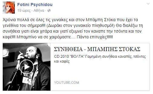 Με μία ανάρτηση μέσω του προσωπικού της λογαριασμού στο Facebook, η Φωτεινή Ψυχίδου ευχήθηκε στις γυναίκες που γιόρταζαν στον πρώην σύζυγο της Μπάμπη Στόκα για τα γενέθλια του. «Χρόνια πολλά σε όλες τις γυναίκες και στον Μπάμπη Στόκα που έχει τα γενέθλια του σήμερα!!! (Δωράκι στον γυναικείο πληθυσμό!) Θα διαλέξω τη συνήθεια γιατί είναι χιτάρα και γιατί εξυμνεί τον καναπέ την τσόντα και τον καφέ!!! Μπαμπίνο να σε χαιρόμαστε… Πάντα επιτυχίες!!!» έγραψε η δημοσιογράφος και δεν ήταν λίγοι όσοι θεώρησαν το post της ειρωνικό και ατυχές…