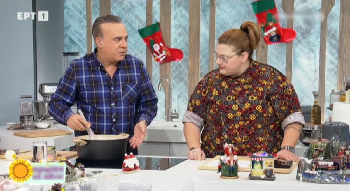 Ο Φώτης Σεργουλόπουλος προθυμοποιήθηκε να βοηθήσει τη Γωγώ Δελογιάννη ανακατεύοντας το μείγμα για το γλυκό της ημέρας. Ωστόσο, δεν παρέλειψε να παρατηρήσει πως τα μαγειρικά σκεύη δεν ήταν τα… πρέποντα.