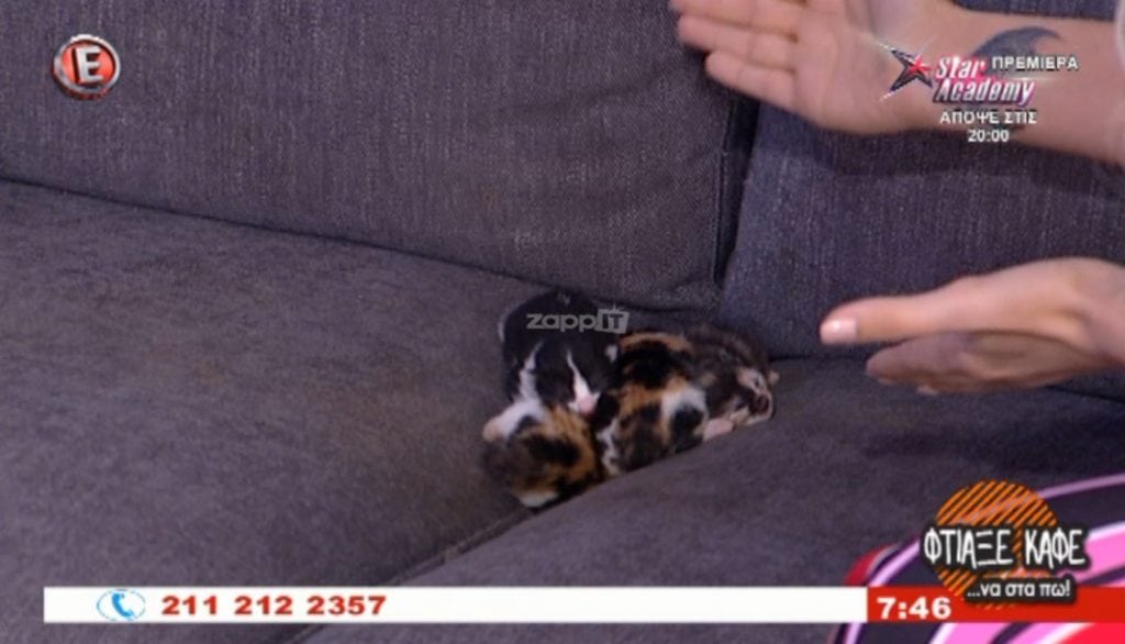 Η γάτα που κυκλοφορεί στο πλατό της εκπομπής Φτιάξε καφέ να στα πω, άφησε τα γατάκια της στον μαλακό καναπέ, μέχρι να επιστρέψει να τα ταΐσει.