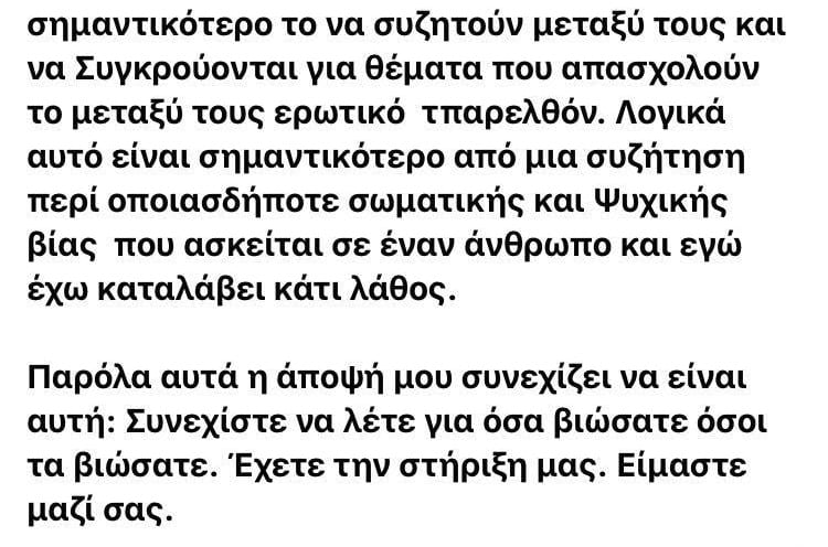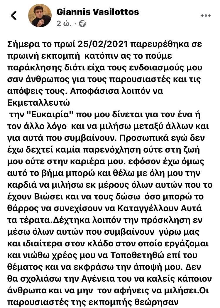 Δέχτηκα λοιπόν την πρόσκληση εν μέσω όλων αυτών που συμβαίνουν γύρω μας και ιδιαίτερα στον κλάδο στον οποίο εργάζομαι και νιώθω χρέος μου να τοποθετηθώ επί του θέματος και να εκφράσω την άποψή μου. Δεν θα σχολιάσω την αγένεια του να καλείς κάποιον άνθρωπο και να μην τον αφήνεις να μιλήσει. Οι παρουσιαστές της εκπομπής θεώρησαν σημαντικότερο το να συζητούν μεταξύ τους και να συγκρούονται για θέματα που απασχολούν το μεταξύ τους ερωτικό παρελθόν. Λογικά αυτό είναι σημαντικότερο από μια συζήτηση περί οποιασδήποτε σωματικής και ψυχικής βίας που ασκείται σε έναν άνθρωπο και εγώ έχω καταλάβει κάτι λάθος» έγραψε ο Γιάννης Βασιλώττος.