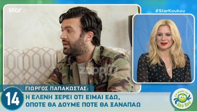 Τι λέει για όλα αυτά ο Γιώργος Παπακώστας; “Άνοιξα το μαγαζί τέλος Νοεμβρίου, μετά έπεσαν οι γιορτές, έχω φάει το ξύλο της αρκούδας εδώ πέρα. Νομίζω έχω πάει 3-4 φορές φέτος στην Ελένη. Η Ελένη ξέρει ότι είμαι εδώ, οπότε θα δούμε πότε θα ξαναπάω. Δεν έχουμε επόμενη προγραμματισμένη εμφάνιση. Δεν έχουμε κουβεντιάσει για “διαζύγιο”. Νόμιζα ότι ήμουν ο μοναδικός που μύριζε η Ελένη Μενεγάκη”, ανέφερε Στη φωλιά των Κου Κου και τον Γιάννη Πουλόπουλο.