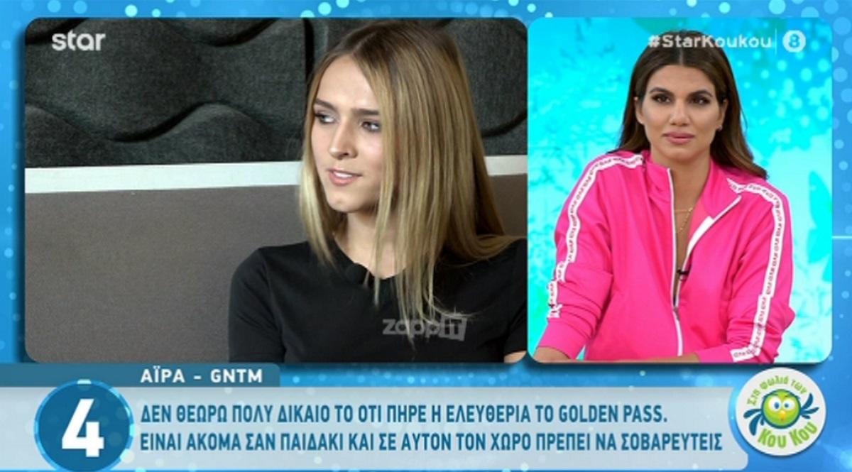 Τον πατέρα μου δεν τον έχω γνωρίσει ποτέ, δεν νομίζω να ξέρει ότι είμαι κόρη του. Δεν θεωρώ πολύ δίκαιο το ότι η Ελευθερία πήρε το Golden Pass. Είναι ακόμα σαν παιδάκι και σε αυτόν τον χώρο πρέπει να σοβαρευτείς», είπε η Άιρα.