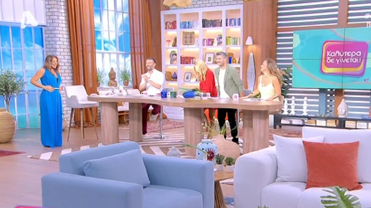 “Πω πω τι πλατό είναι αυτό! Σας επιθυμήσαμε” ανέφερε η Ναταλία Γερμανού και στη συνέχεια απευθύνθηκε στους παλιότερους της συνεργάτες τη Ναταλία Αργυράκη και τον Παναγιώτη Ραφαηλίδη και τους νέους της συνεργάτες, την Ελιάνα Χρυσικοπούλου και τον Άγγελο Βουράκη.