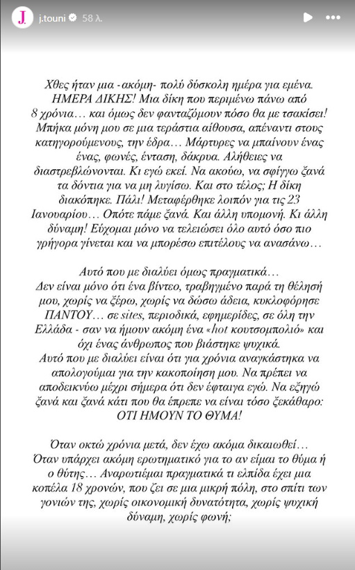 «Χθες ήταν μια -ακόμη- πολύ δύσκολη ημέρα για εμένα. ΗΜΕΡΑ ΔΙΚΗΣ! Μια δίκη που περίμενα πάνω από 8 χρόνια… και όμως δεν φανταζόμουν πόσο θα με τσακίσει! Μπήκα μόνη μου σε μια τεράστια αίθουσα, απέναντι στους κατηγορούμενους, την έδρα… Μάρτυρες να μπαίνουν ένας ένας, φωνές, ένταση, δάκρυα. Αλήθειες να διαστρεβλώνονται. Κι εγώ εκεί. Να ακούω, να σφίγγω ξανά τα δόντια για να μη λυγίσω. Και στο τέλος; Η δίκη διακόπηκε. Πάλι! Μεταφέρθηκε λοιπόν για τις 23 Ιανουαρίου… Οπότε πάμε ξανά. Και άλλη υπομονή. Κι άλλη δύναμη! Εύχομαι μόνο να τελειώσει όλο αυτό όσο πιο γρήγορα γίνεται και να μπορέσω επιτέλους να ανασάνω…