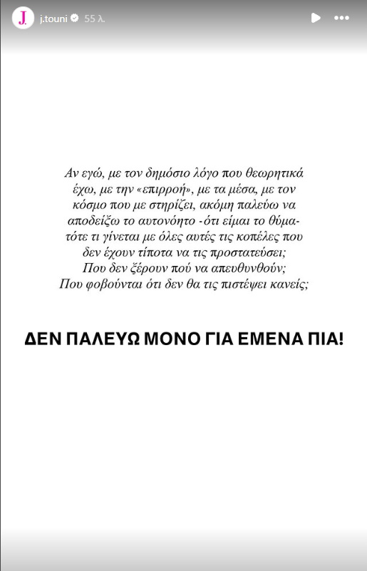 Αν εγώ, με τον δημόσιο λόγο που θεωρητικά έχω, με την «επιρροή», με τα μέσα, με τον κόσμο που με στηρίζει, ακόμη παλεύω να αποδείξω το αυτονόητο –ότι είμαι το θύμα– τότε τι γίνεται με όλες αυτές τις κοπέλες που δεν έχουν τίποτα να τις προστατεύσει; Που δεν ξέρουν πού να απευθυνθούν; Που φοβούνται ότι δεν θα τις πιστέψει κανείς; ΔΕΝ ΠΑΛΕΥΩ ΜΟΝΟ ΓΙΑ ΕΜΕΝΑ ΠΙΑ!