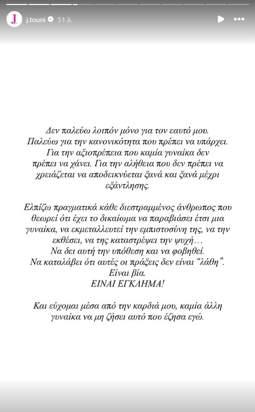 Με ένα μακροσκελές μήνυμα στο Instagram η Ιωάννα Τούνη θέλησε να εκφράσει όλες τις σκέψεις και τα συναισθήματά της για τη νέα διακοπή της δίκης της για το revenge porn.