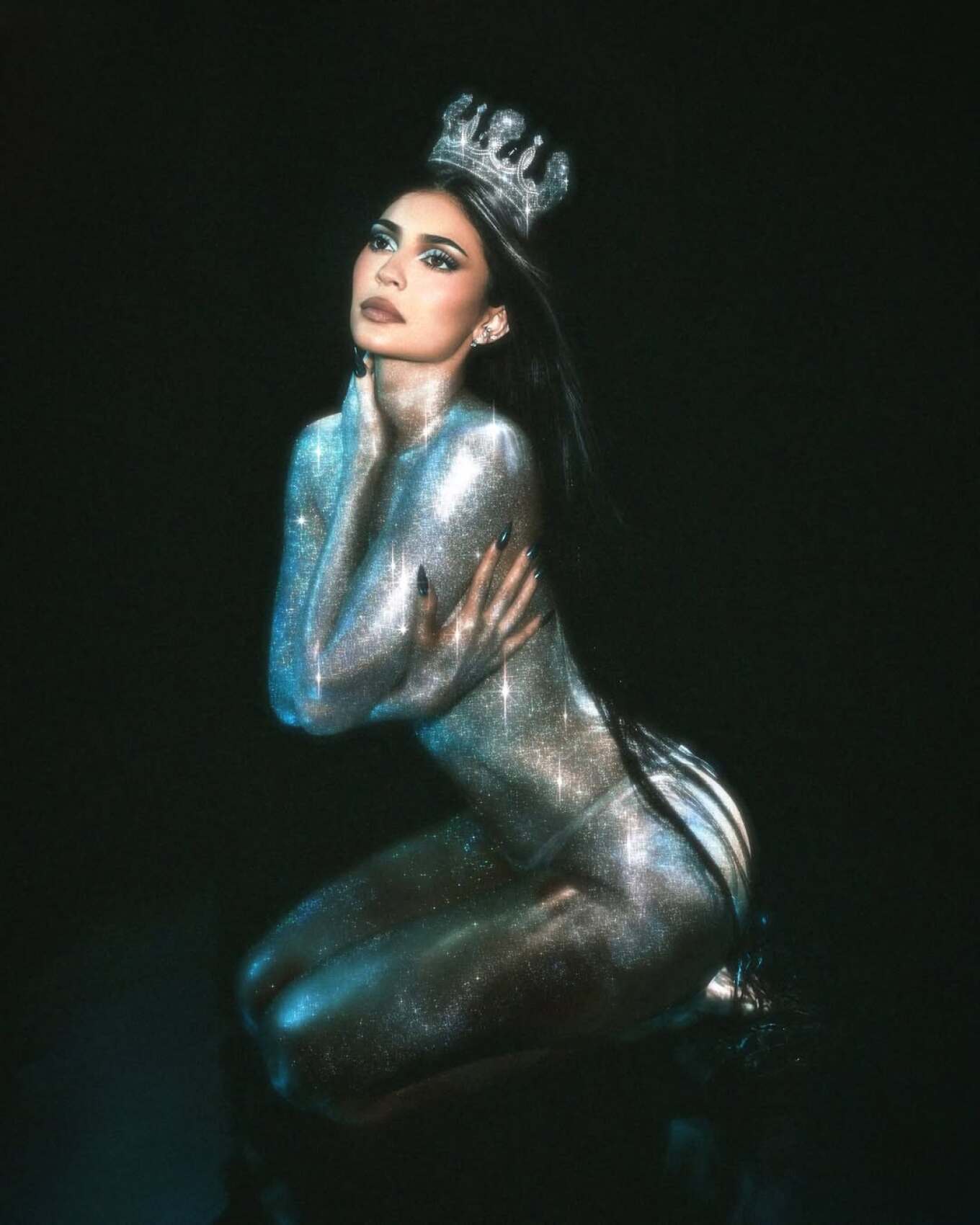 Στις φωτογραφίες που ανήρτησε στο Instagram, η Κάιλι Τζένερ δεν δίστασε να ποζάρει γυμνή, “φορώντας” μόνο ασημένιο γκλίτερ και ένα στέμμα.