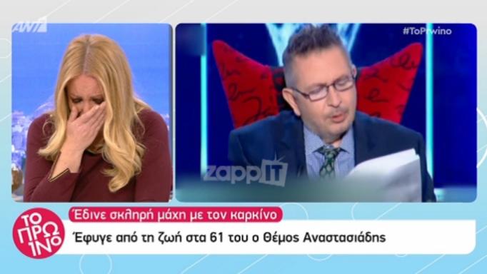 Ο Θέμος Αναστασιάδης έφυγε από τη ζωή και ο αποχαιρετισμός για όσους τον έζησαν από κοντά είναι δύσκολος. Η Αφροδίτη Γραμμέλη, συνεργάτιδα του δημοσιογράφου στην εφημερίδα Πρώτο Θέμα, κατέρρευσε στον αέρα του Πρωινό όταν χρειάστηκε να πει δυο λόγια για τον θάνατο του παρουσιαστή και εκδότη.