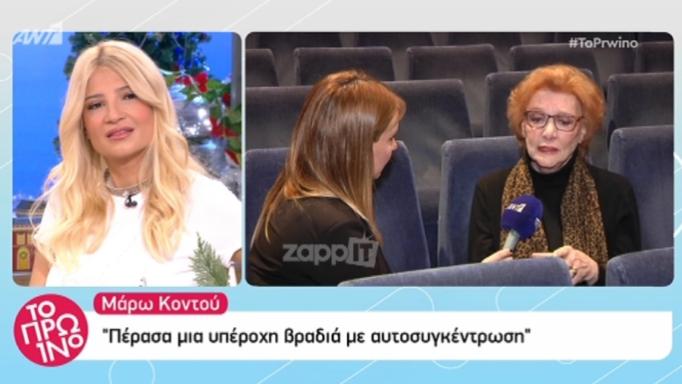 Με εξομολογητική διάθεση, αλλά και με σκέψεις η Μάρω Κοντού μίλησε στη Μαίρη Αρώνη και στο Πρωινό. «Η Πρωτοχρονιά αυτή ήταν μοναχική, γιατί το επέλεξα. Είχαμε πολλές παραστάσεις και έτσι επέλεξα την παραμονή της Πρωτοχρονιάς να κλειστώ στο ωραίο μου σπιτάκι, με τη ζέστη μου, να μπορέσω να στείλω άνετα τις ευχές που ήθελα. Πέρασα μια υπέροχη βραδιά με αυτοσυγκέντρωση και αυτές τις ημέρες, πάντα υπάρχει ένα κομμάτι θλίψης για το πως είναι σήμερα η Ελλάδα, για αυτούς που δεν έχουν αυτά που πρέπει. Γενικά είναι μια ωραία συνομιλία με τον ίδιο σου τον εαυτό.