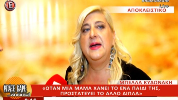 Η Μπέλλα Κυδωνάκη μίλησε στο μικρόφωνο της εκπομπής Φτιάξε καφέ να στα πω, για το πόσο προστατευτική είναι με την κόρη της μετά την απώλεια του γιου της. «Είμαι παραπάνω υπερπροστατευτική με την κόρη μου, αλλά τώρα ήθελα να της δώσω μια σπρωξιά και μετά να μείνω πιο πίσω. Όταν μια μαμά χάνει το ένα παιδί, θέλει να προστατεύσει το άλλο διπλά. Πιστεύω ότι υπάρχει κι άλλη ζωή μετά τον θάνατο. Είναι το πιο δύσκολο γεγονός για έναν άνθρωπο, αλλά πρέπει να επιβιώσουμε. Η ζωή σε σπρώχνει και σου λέει προχώρα, δεν μπορείς να μείνεις πίσω. Είναι σαν χείμαρρος που αν την αφήσεις θα σε πνίξει».