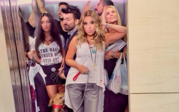 Με γνώμονα το χιούμορ η παρουσιάστρια μπήκε στο ασανσέρ με τους συνεργάτες της έχοντας συντροφιά της το σκύλο της τον Γκούφι.