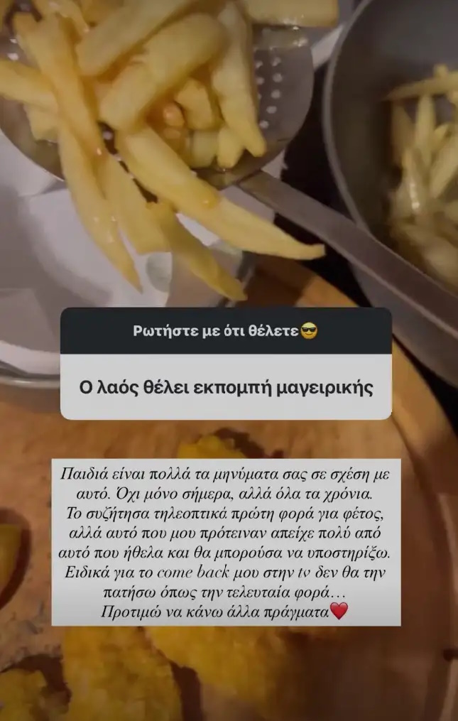 «Παιδιά, είναι πολλά τα μηνύματά σας σε σχέση με αυτό. Όχι μόνο σήμερα, αλλά όλα τα χρόνια. Το συζήτησα τηλεοπτικά πρώτη φορά φέτος, αλλά αυτό που μου προτείναν απείχε πολύ από αυτό που ήθελα και δεν θα μπορούσα να υποστηρίξω. Ειδικά για το comeback μου στην TV, δεν θα την πατήσω όπως την τελευταία φορά. Προτιμώ να κάνω άλλα πράγματα», σημείωσε η Νικολέττα Ράλλη στην ανάρτησή της.