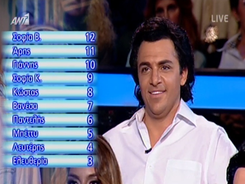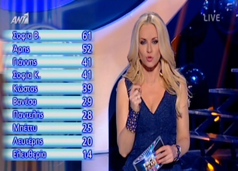 Οι βαθμοί μετατρέπονται σε πόντους. Η Σοφία Βόσσου προηγείται και η Κατερίνα Γκαγκάκη αποφασίζει να δώσει το 10 στον Γιάννη Σαββιδάκη που ισοβαθμεί με τη Σοφία Κουρτίδου.