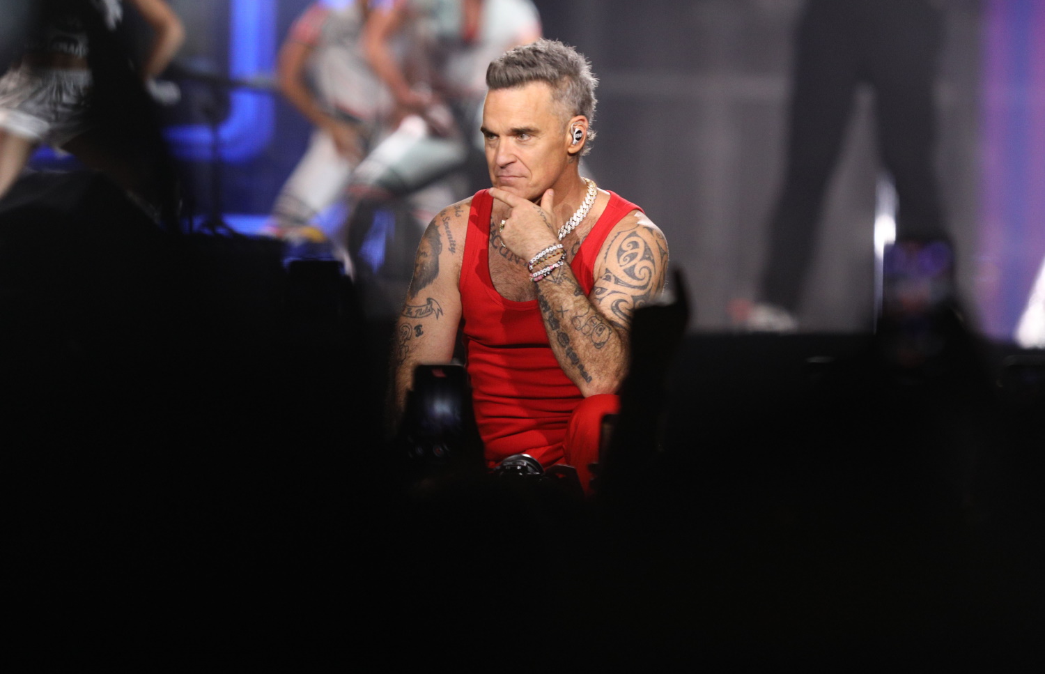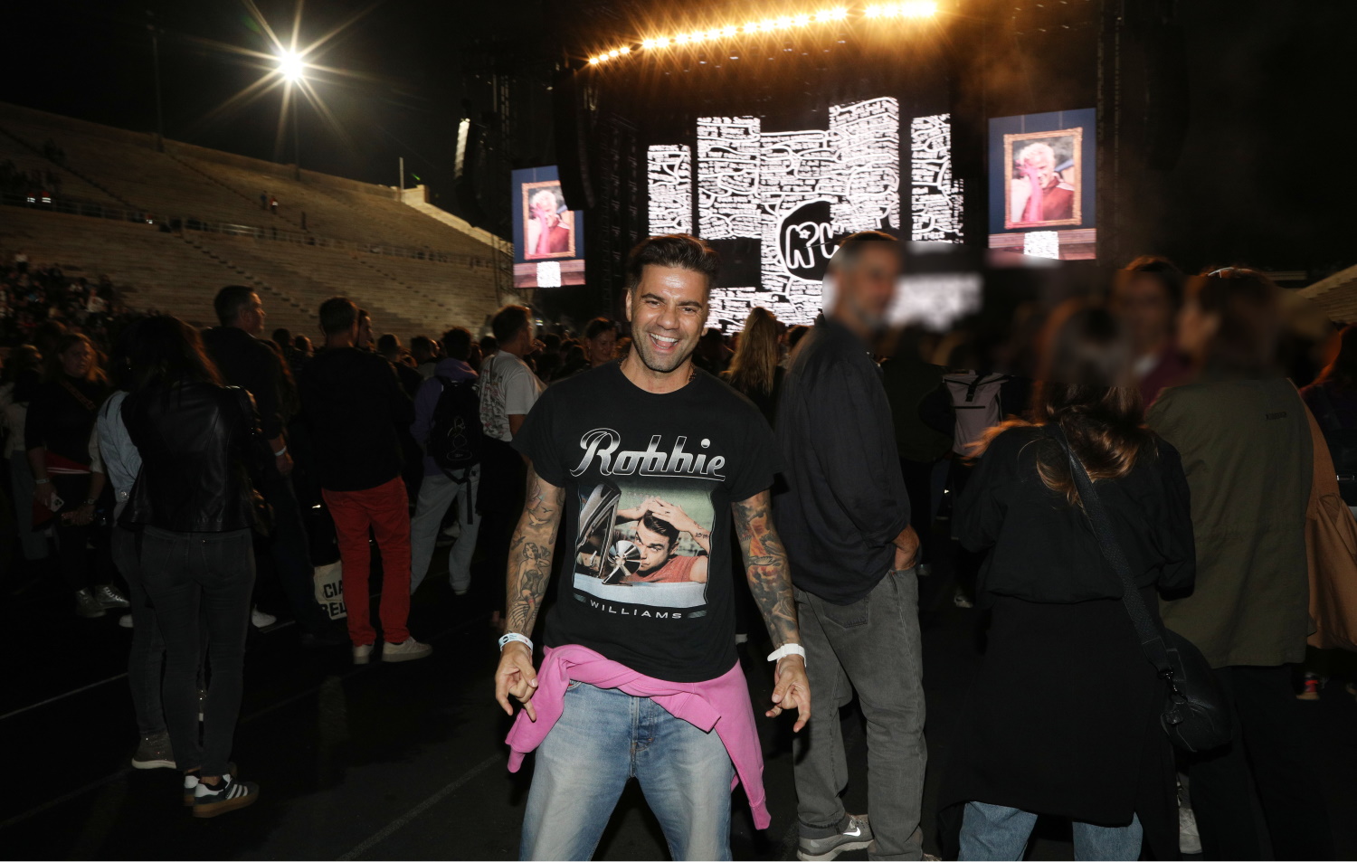 Ντυμένος στα κόκκινα – και όχι μόνο – ο Ρόμπι Γουίλιαμς εμφανίστηκε στο Παναθηναϊκό Στάδιο και απέδειξε ότι ο χρόνος δεν έχει «περάσει από πάνω του».
