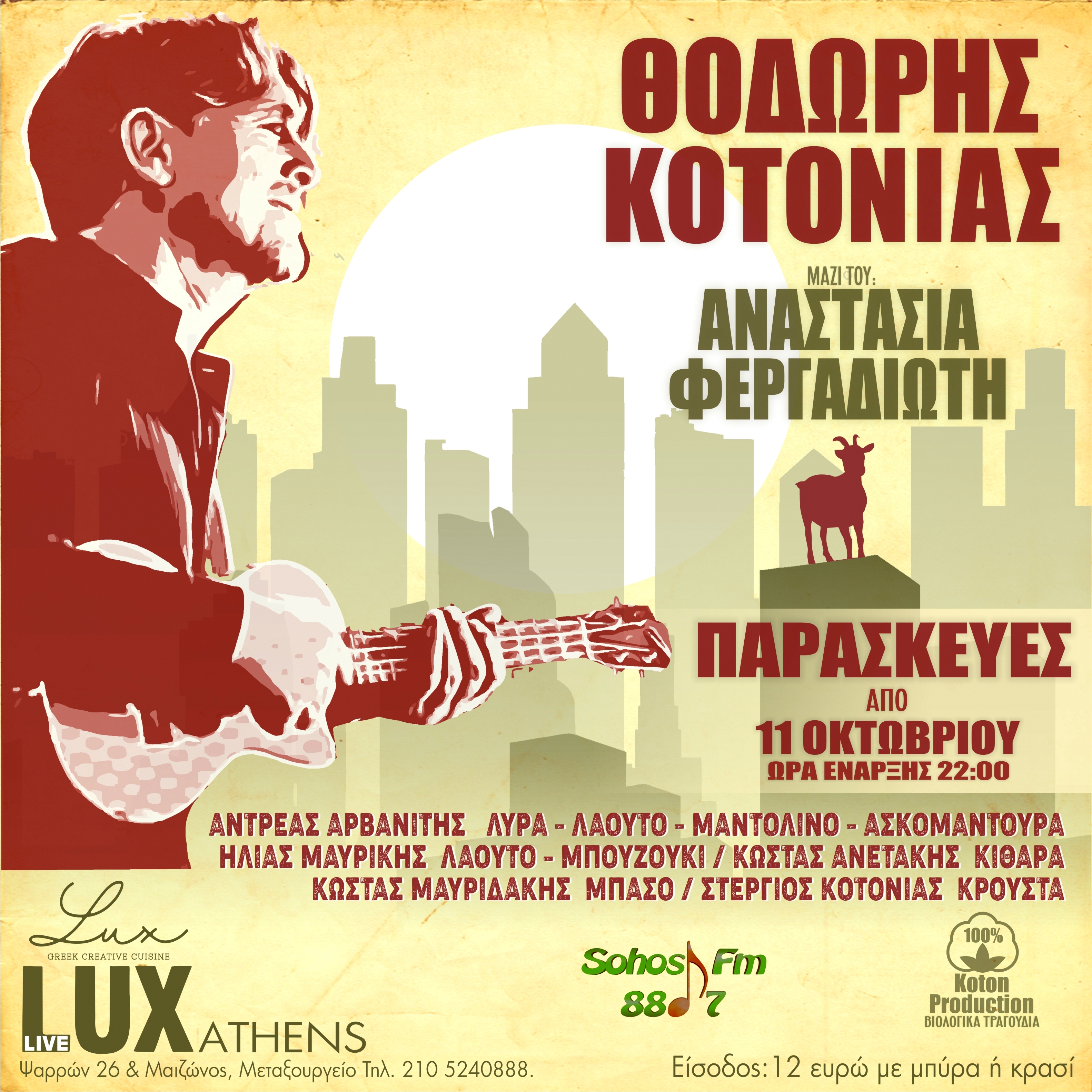 Επιστρέφοντας από τη καλοκαιρινή περιοδεία ο Θοδωρής Κοτονιάς και η ανανεωμένη μουσική του παρέα δίνει ραντεβού για τις χειμερινές του παραστάσεις όλες τις Παρασκευές μέχρι το τέλος του χρόνου με έναρξη από τις 11/10 στην Αθήνα στον ατμοσφαιρικό χώρο απόλαυσης γεύσεων & εξαιρετικών κρασιών -ποτών LUX Athens!