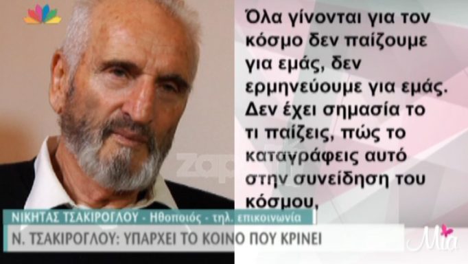 Νικήτας Τσκίρογλου: «Δεν έχω καμία αντιπάθεια με το παιδί. Γιατί δεν είναι προσωπικό το θέμα. Ευτυχώς που υπάρχει το κοινό που αυτό κατακυρώνει τα πράγματα ή τα γελοιοποιεί. Όλα γίνονται για τον κόσμο. Δεν παίζουμε για εμάς. Δεν έχει σημασία το τι παίζεις. Πως το καταγράφεις αυτό στη συνείδηση του κόσμου και το λέει και ο Ελύτης μέσα «όλα είναι μνήμη». Καλή επιτυχία εύχομαι, όπως θα το ευχόμουν σε οποιοδήποτε άλλο. Δεν είναι θέμα δηλαδή ο Σάκης ο Ρουβάς.