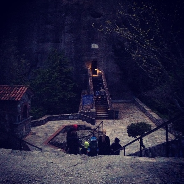 Μπαίνοντας στο μοναστήρι απο τη λαξευτή είσοδο μέσα απο το βράχο.