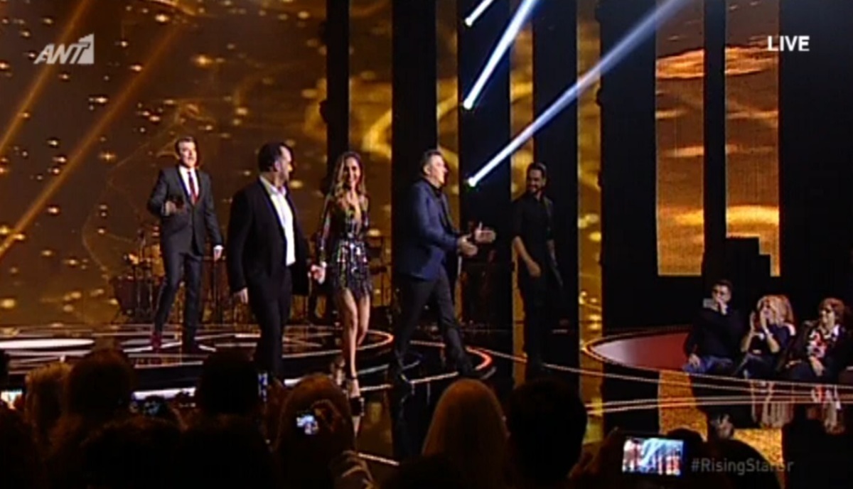 21:06 Οι τέσσερις κριτές: Αντώνης Ρέμος, Δέσποινα Βανδή, Κώστας Μακεδόνας και Χρήστος Μάστορας μπαίνουν στη σκηνή. Οι θεατές ενθουσιασμένοι σε ατμόσφαιρα πανηγυρική…