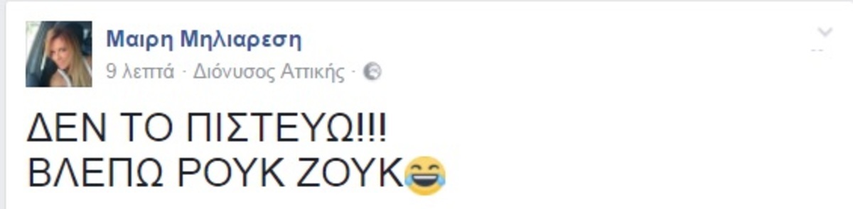 Και πράγματι, η Μαίρη Μηλιαρέση είδε την πρεμιέρα του Ρουκ Ζουκ στον ΑΝΤ1… κι έγραψε στον προσωπικό της λογαριασμό στο Facebook: