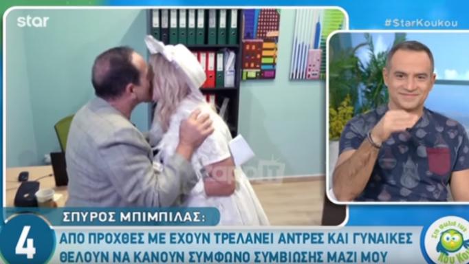 «Πριν αποχωρήσω από τη ζωή, σύμφωνο συμβίωσης θα έχω κάνει οπωσδήποτε, γιατί πρέπει κάποιος να πάρει και τη σύνταξη μου, να εκδικηθώ το κράτος» δήλωσε πριν λίγες ημέρες ο Σπύρος Μπιμπίλας και τα όσα είπε έδωσαν έμπνευση στην Νάντια Ρηγάτου που ντύθηκε νυφούλα, έφτιαξε τα χαρτιά και πήγε να τον βρει για να το υπογράψουν.