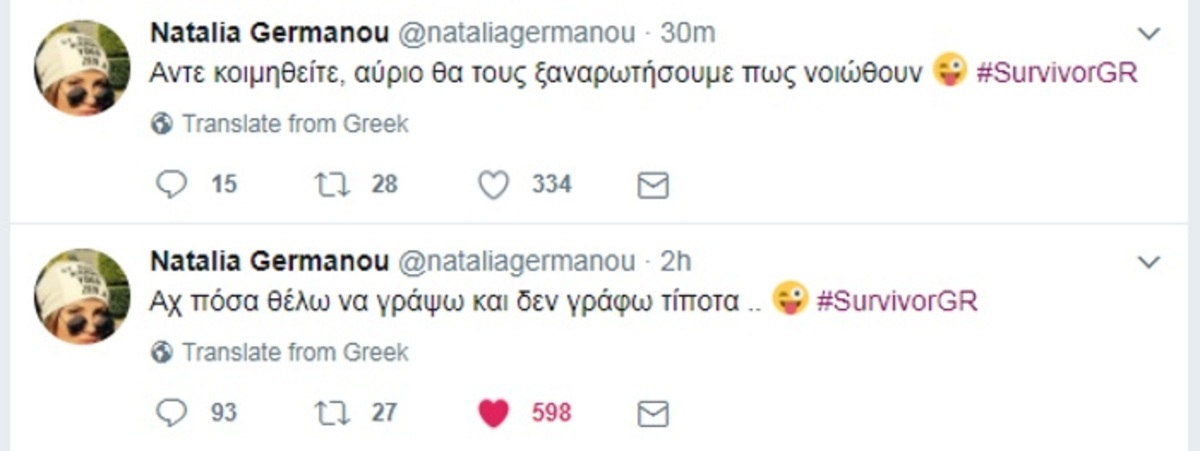 Η γνωστή παρουσιάστρια κάνει συχνά tweets στον προσωπικό της λογαριασμό και σχολιάζει πράγματα και καταστάσεις από το ριάλιτι επιβίωσης.