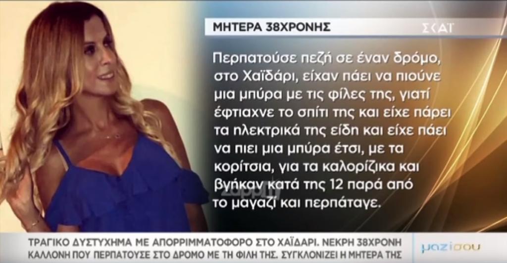 «Περπατούσε πεζή σε ένα δρόμο στο Χαϊδάρι, είχαν πάει να πιούμε μια μπύρα με τις φίλες της γιατί έφτιαχνε το σπίτι της και είχε πάρει τα ηλεκτρικά της είδη και είχε πάει να πιει μια μπύρα έτσι με τα κορίτσια, για τα καλορίζικα και βγήκαν κατά τις 12 παρά από το μαγαζί και περπάταγε. Είχε βάλει το αυτοκίνητό της σε έναν δρόμο, ο οποίος ήταν στενός, από τη μία μεριά είχε πεζοδρόμιο και από την άλλη δεν είχε και περπάτησαν στον δρόμο και ήταν σταματημένος αυτός με το απορριμματοφόρο. Ήταν σταματημένος αυτός και τα παιδιά είχαν περάσει μπροστά και περπατάγανε 15 μέτρα μπροστά. Δεν ξέρω αγάπη μου τι έκανε και πώς χτύπησε το παιδί μου.