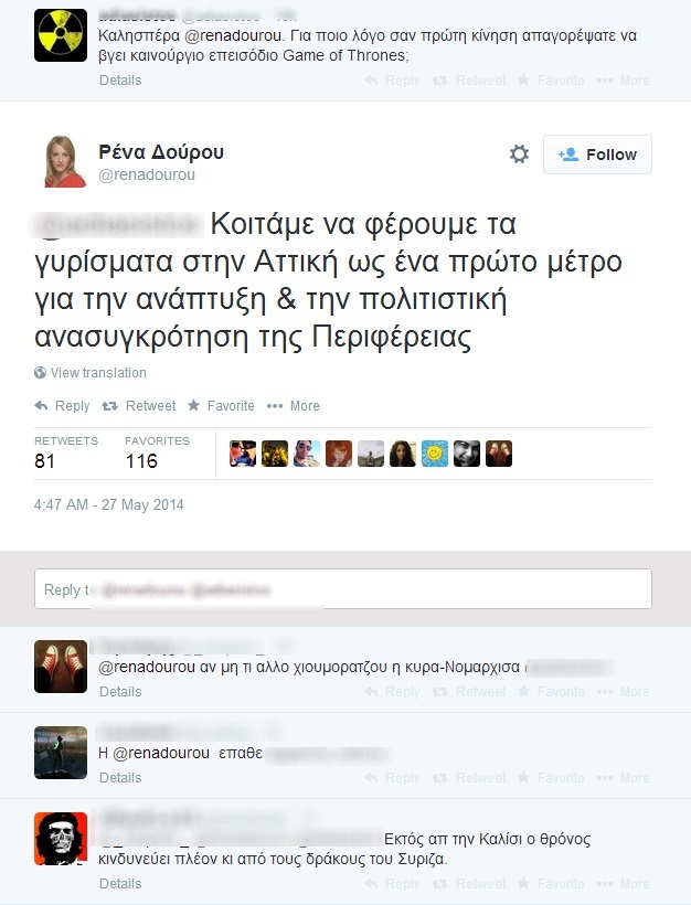 Ένας απίστευτος διαδικτυακός διάλογος ξεκίνησε στο προφίλ της Περιφερειάρχη Αττικής Ρένας Δούρου στο twitter όταν την ρώτησαν γιατί η πρώτη της κίνηση ως εκλεγμένη στην Περιφέρεια ήταν να… απαγορεύσει να βγει καινούριο επεισόδιο στην δημοφιλή Αμερικανική σειρά Game Of Thrones.