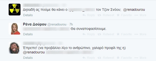 Η Ρένα Δούρου όχι μόνο απάντησε, αλλά συνέχισε το… τρολάρισμα, αποδεικνύοντας αν μη τι άλλο πως διαθέτει χιούμορ. Ο σπαρταριστός διάλογος συνεχίστηκε και μέρος του μπορείτε να δείτε στη συνέχεια…