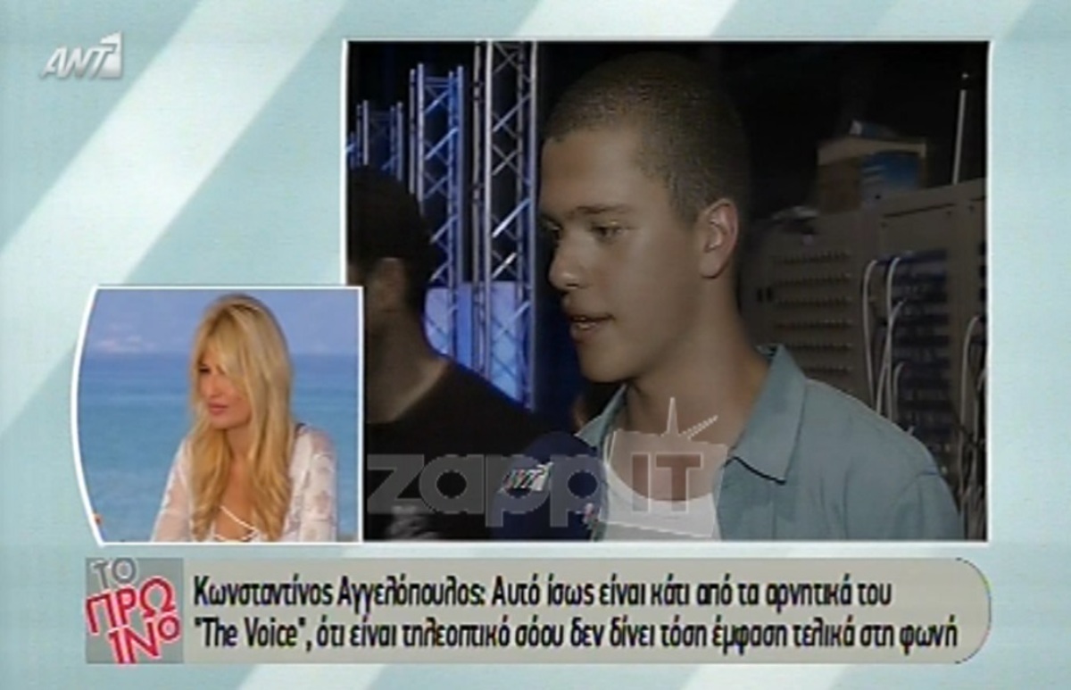 «Όλα καλά. Νομίζω, έφυγε ένα βάρος από πάνω μου. Είμαι χαλαρός, όλα καλά. Μια υποχρέωση λιγότερο. Από ένα σημείο και μετά όλες οι υποχρεώσεις σε καταβάλουν και στο τέλος δεν πας καλά σε καμία. Να σου πω την αλήθεια μου θεωρώ ότι οι καλύτερες φωνές έχουν φύγει από το The Voice. Χωρίς να βάζω τον εαυτό μου μέσα, δεν θεωρώ ότι ήμουν από τις καλύτερες φωνές του Voice. Αυτό είναι ίσως από τα αρνητικά του “The Voice” ότι είναι τηλεοπτικό show, δεν δίνει τόση έμφαση τελικά στη φωνή», ανέφερε ο Κωνσταντίνος Αγγελόπουλος.