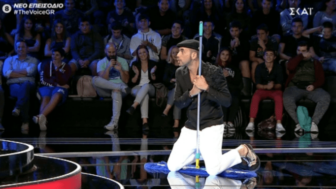 Μα ο εκκεντρικός καλλιτέχνης ξεκίνησε να καθαρίζει με μια σκούπα και τρόπο απολαυστικό τον δρόμο από τη σκηνή και την 19χρονη διαγωνιζόμενη μέχρι την καρέκλα του!