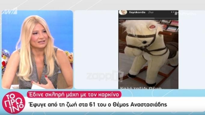 Συνάδελφοι και φίλοι αποχαιρετούν τον Θέμο Αναστασιάδη, ο καθένας με τον δικό του τρόπο μέσα από τα social media. Η ανάρτηση της Φαίης Σκορδά προκάλεσε αίσθηση. Ένα ξύλινο αλογάκι και δυο λόγια «Καλό ταξίδι Θέμο». Τη σημασία πίσω από αυτή την ανάρτηση την αποκάλυψε λίγο αργότερα στο Πρωινό.