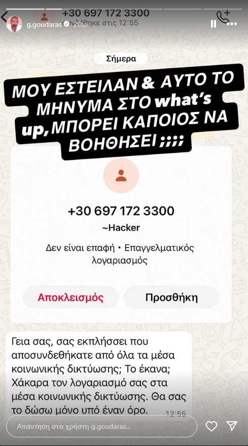 “Μου έστελναν κανονικό διάλογο με το σήμα του TikTok για το πώς μπορώ να ανακτήσω τον λογαριασμό μου. Ένας λογαριασμός στο What’sApp μου είπε: είμαστε οι χάκερς, για να πάρεις πίσω τον λογαριασμό σου πρέπει να κάνεις αυτά τα βήματα. Από τη Δίωξη μου είπαν να μη διανοηθώ να απαντήσω στο μήνυμα. Κι αυτό χακαρισμένο τηλέφωνο στο What’sApp ήταν. Μιλάμε για τρελά πράγματα, παιδιά”, περιέγραψε αμέσως μετά ο Γρηγόρης Γκουντάρας στον αέρα του ΑΝΤ1.
