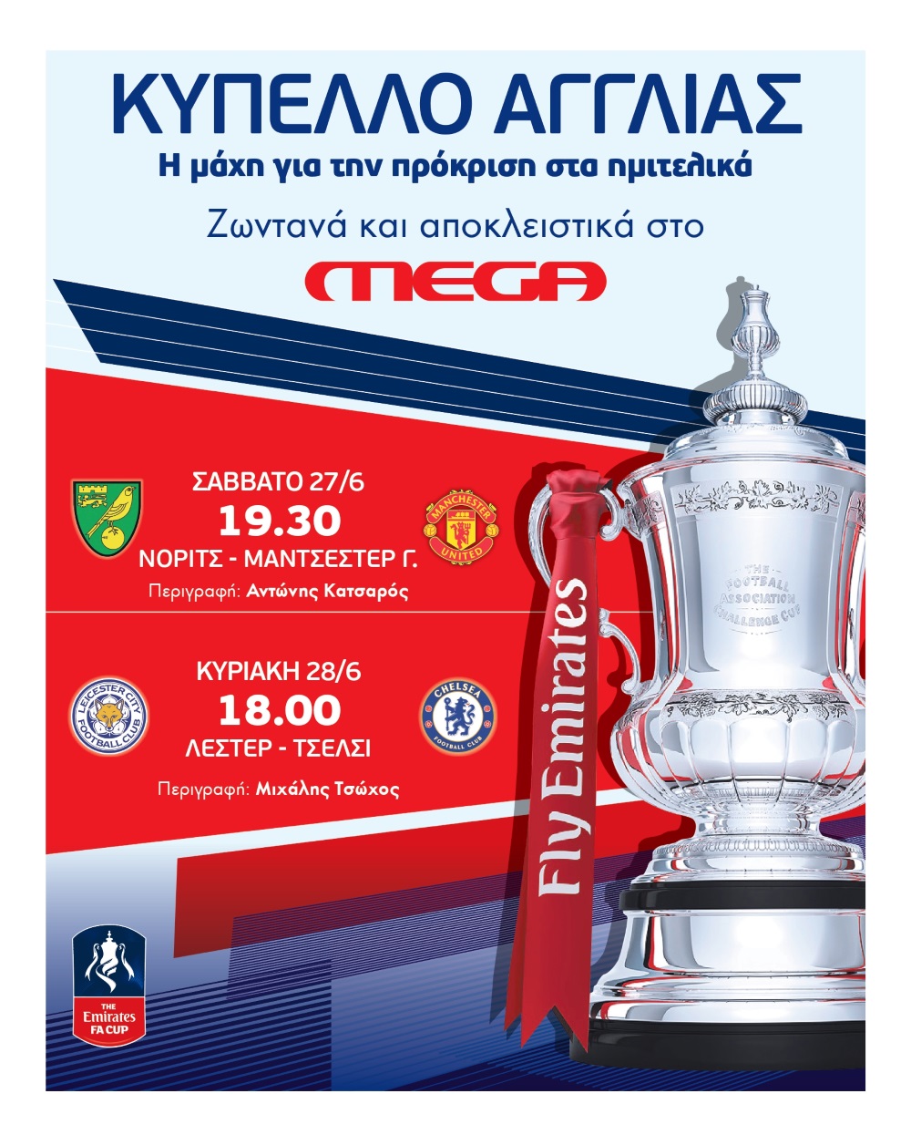 Την Κυριακή 28/6 στις 18.00 η Λέστερ αντιμετωπίζει την Τσέλσι στο ντέρμπι της 8άδας του θεσμού. Οι δύο τελευταίες πρωταθλήτριες (2016 και 2017 αντίστοιχα) πριν τη Μάντσεστερ Σίτυ, ήδη μονομαχούν για την 4άδα του πρωταθλήματος. Οι γηπεδούχοι θέλουν να βρεθούν στον 5ο τελικό της ιστορίας τους, έχοντας χάσει τους προηγούμενους (ο τελευταίος το 1969), ενώ οι Λονδρέζοι βρίσκονται στο κυνήγι του 9ου τροπαίου. Σμάιχελ, Ολμπράιτον, Βάρντι, Ιχεανάτσο, Κέπα, Καντέ, Ζιρού και Γουίλιαν είναι μερικοί από τους αστέρες, που θα πατήσουν τον αγωνιστικό χώρο του King Power. Περιγράφει ο Μιχάλης Τσώχος.