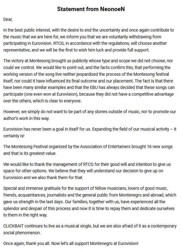 Ωστόσο, τα πράγματα δεν φαίνεται πως κύλησαν θετικά για τους NeonoeN, αφού νωρίτερα σήμερα έγινε γνωστό πως ο εθνικός ραδιοτηλεοπτικός φορέας της χώρας τους (RTCG) προχώρησε στην απόσυρση του τραγουδιού, στη σκιά ενός σκανδάλου. Πιο συγκεκριμένα, η απόσυρση της συμμετοχής προέκυψε μετά τη δημοσιοποίηση ενός snippet video του συγκροτήματος, που φέρεται να ερμήνευσε το “Clickbait” στο μουσικό φεστιβάλ Kulture Zabjelo στην πρωτεύουσα της χώρας, την Ποντγκόριτσα, το 2023.