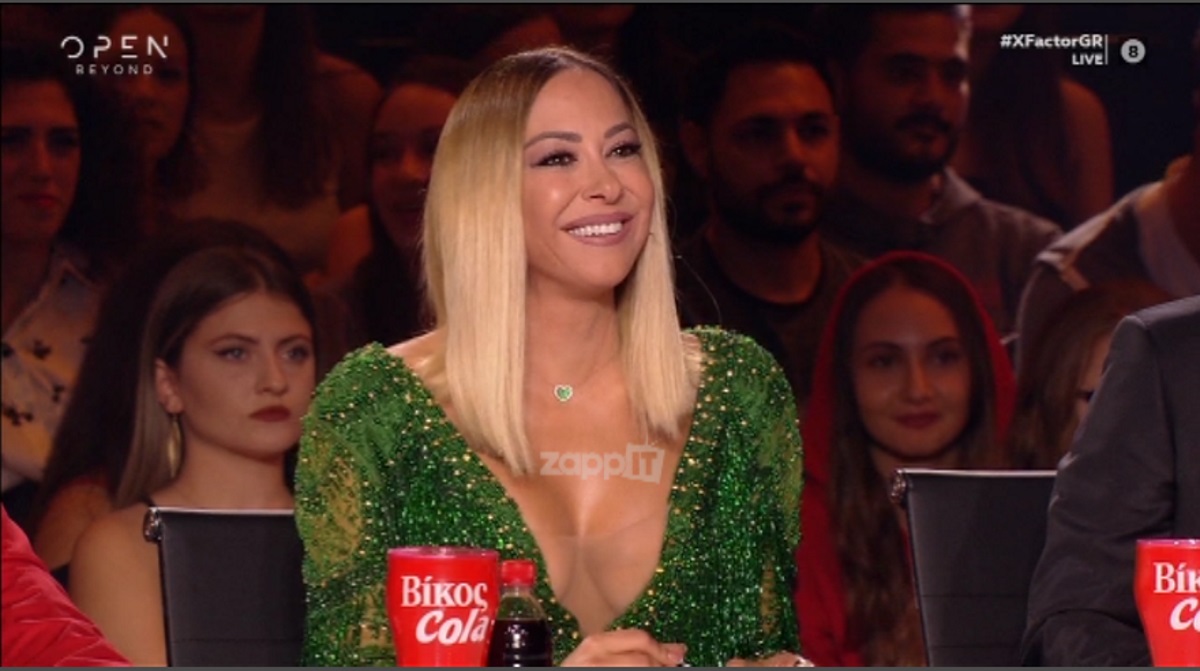 Η γνωστή τραγουδίστρια και coach της ομάδας των “25+” εμφανίστηκε στη σκηνή με ένα πράσινο φόρεμα και με ορθάνοιχτο ντεκολτέ, που τόνιζε το πλούσιο μπούστο της!