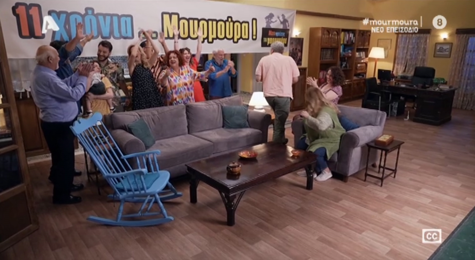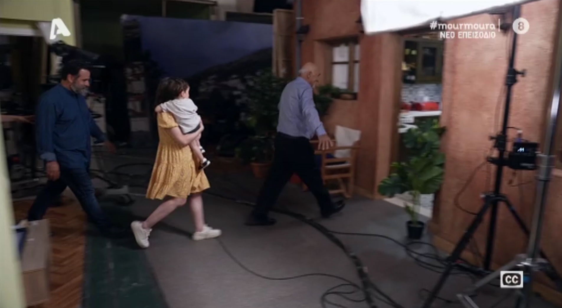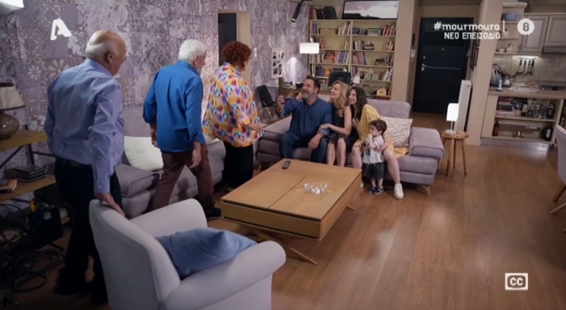 Όλοι μαζί, δευτερόλεπτα αργότερα, μεταφέρθηκαν στο διπλανό πλατό για να συναντήσουν τη Ζωή και τον Φάνη και φυσικά να τους πάρουν και αυτούς μαζί τους. Έτσι, διασχίζοντας όλο τον χώρο που γίνονταν όλα αυτά τα χρόνια τα γυρίσματα για το σίριαλ “Μην αρχίζεις τη μουρμούρα” κατέληξαν στο σαλόνι του σπιτιού του κυρ Ηλία.