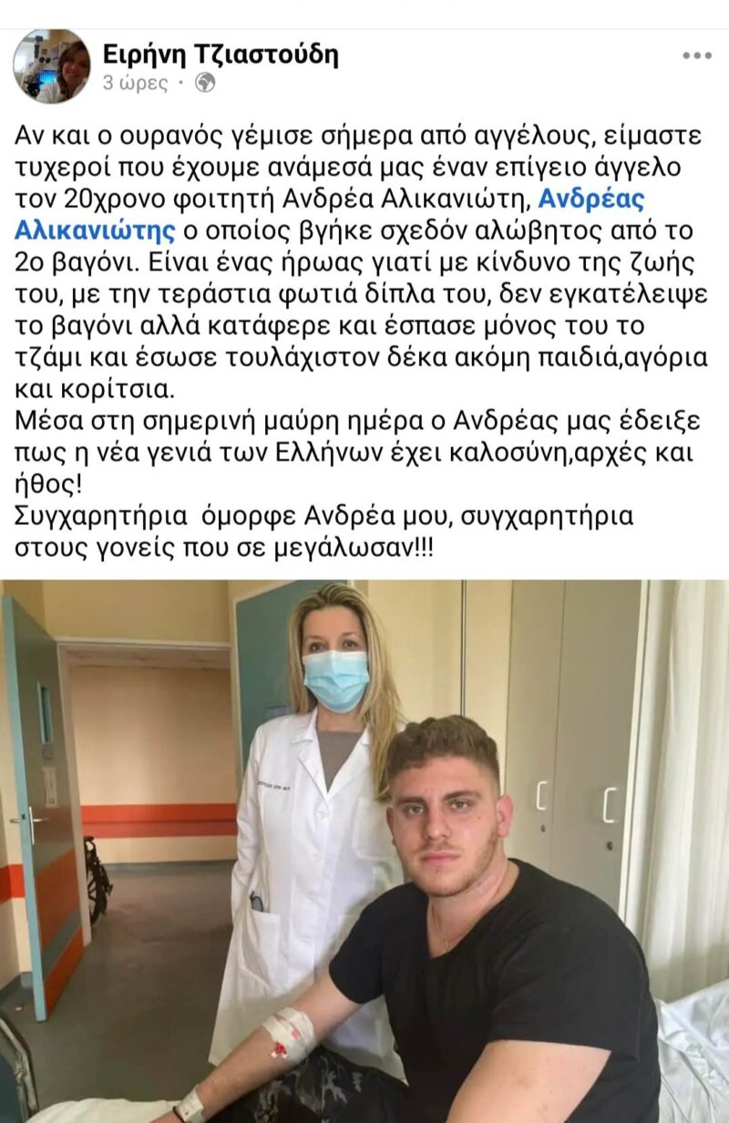 Ειδικότερα, μέσα από τον προσωπικό της λογαριασμό στο Facebook, γιατρός του Πανεπιστημιακού Νοσοκομείου Λάρισας θέλησε να ευχαριστήσει δημόσια τον νεαρό άνδρα με μια συγκινητική ανάρτηση. “Αν και ο ουρανός γέμισε σήμερα από αγγέλους, είμαστε τυχεροί που έχουμε ανάμεσά μας έναν επίγειο άγγελο τον 20χρονο φοιτητή Ανδρέα Αλικανιώτη, ο οποίος βγήκε σχεδόν αλώβητος από το 2ο βαγόνι. Είναι ένας ήρωας γιατί με κίνδυνο της ζωής του, με την τεράστια φωτιά δίπλα του, δεν εγκατέλειψε το βαγόνι αλλά κατάφερε και έσπασε μόνος του το τζάμι και έσωσε τουλάχιστον δέκα ακόμη παιδιά, αγόρια και κορίτσια”.