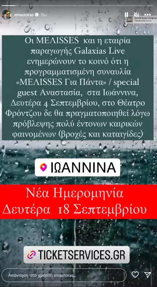 «Οι Μέλισσες και η εταιρεία παραγωγής ενημερώνουν το κοινό ότι την προγραμματισμένη συναυλία “MELISSES Για Πάντα / special guest Αναστασία”, στα Ιωάννινα Δευτέρα 4 Σεπτεμβρίου στο θέατρο Φρόντζου δεν θα πραγματοποιηθεί λόγω προβλέψεις πολύ έντονων καιρικών φαινομένων (βροχές και καταιγίδες)» έγραψε ο Χρήστος Μάστορας ενώ ενημέρωσε για τη νέα ημερομηνία της συναυλία την Δευτέρα 18 Σεπτεμβρίου.