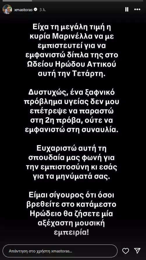 «Είχα τη μεγάλη τιμή, η κυρία Μαρινέλλα να με εμπιστευτεί να εμφανιστώ δίπλα της στο Ωδείο Ηρώδου Αττικού αυτή την Τετάρτη. Δυστυχώς, ένα ξαφνικό πρόβλημα υγείας δεν μου επέτρεψε να παραστώ στην δεύτερη πρόβα, ούτε να εμφανιστώ στη συναυλία. Ευχαριστώ αυτή τη σπουδαία μας φωνή για την εμπιστοσύνη κι εσάς για τα μηνύματά σας.