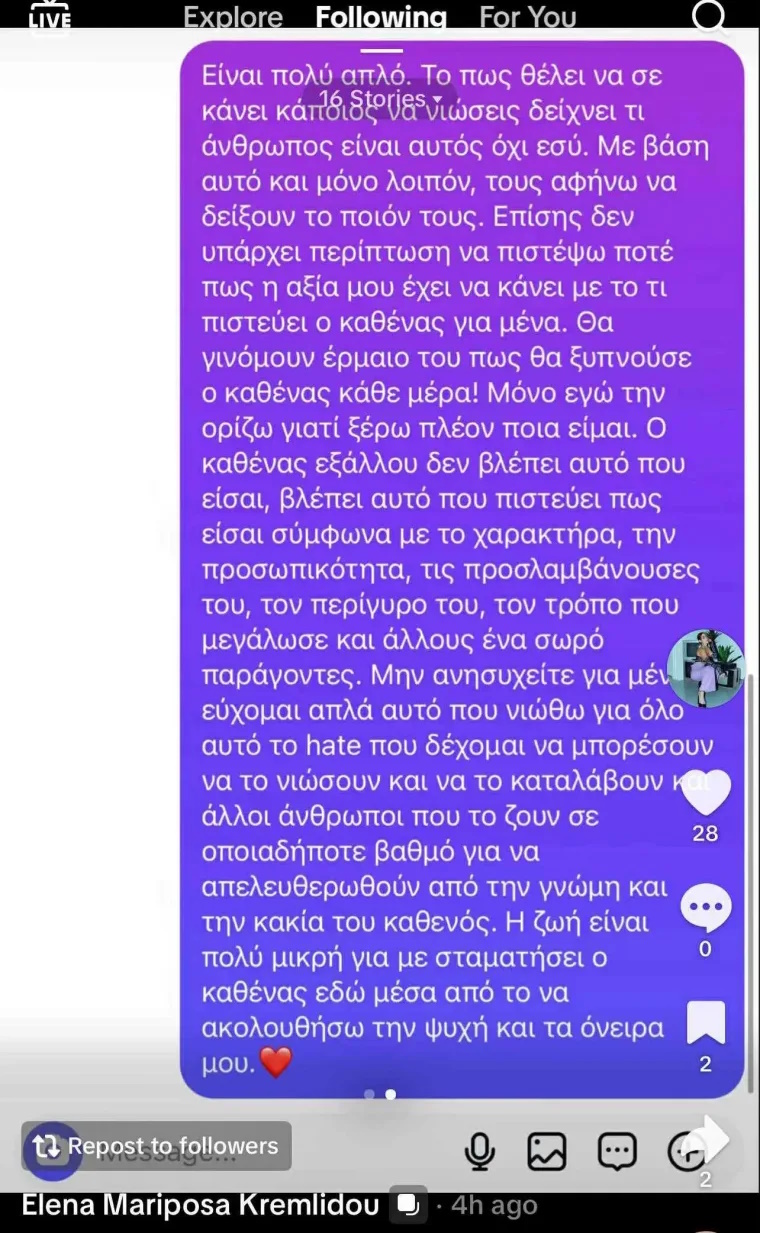 «Η ζωή είναι πολύ μικρή για να σταματήσω ή να κάνω πίσω επειδή κάποιος είπε κάτι. Εγώ θα συνεχίσω να ακολουθώ την ψυχή και τα όνειρά μου», κατέληξε στο μήνυμά της η Έλενα Κρεμλίδου.