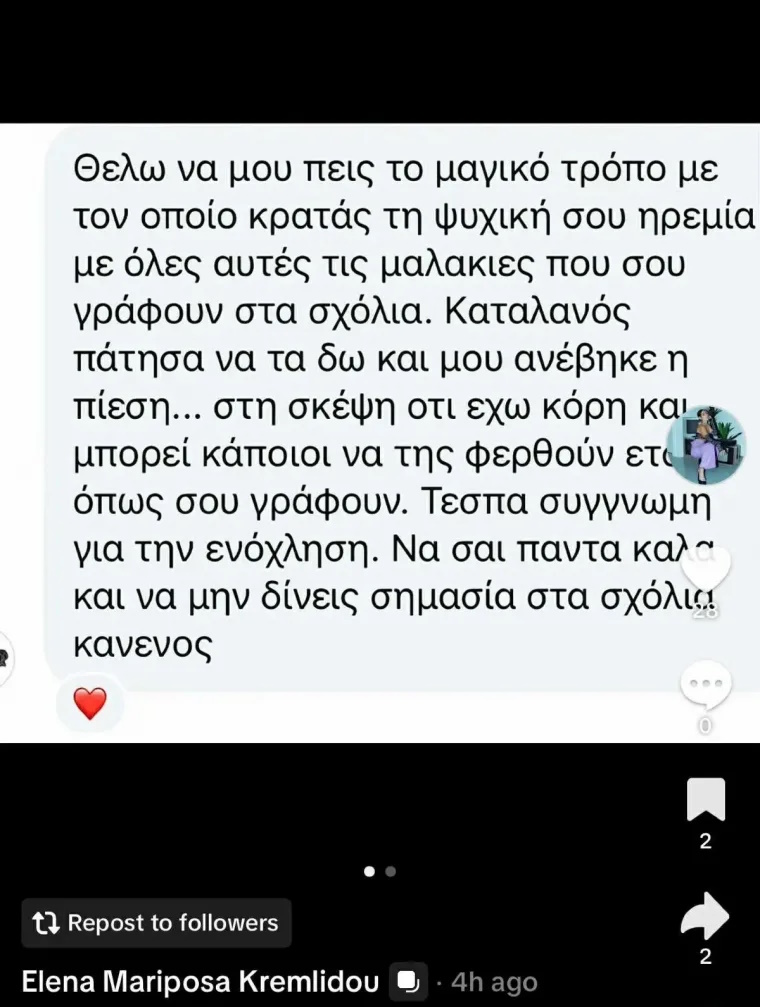 «Θέλω να μου πεις τον μαγικό τρόπο με τον οποίο κρατάς την ψυχική σου ηρεμία με όλες αυτές τις μαλ@κίες που σου γράφουν στα σχόλια. Καταλάθος πάτησα να τα δω και μου ανέβηκε η πίεση… Στη σκέψη ότι έχω κόρη και μπορεί κάποιοι να της φερθούν έτσι όπως σου γράφουν. Τέσπα, συγγνώμη για την ενόχληση. Να ’σαι πάντα καλά και να μην δίνεις σημασία στα σχόλια κανενός», τη ρώτησε follower στο Messenger.