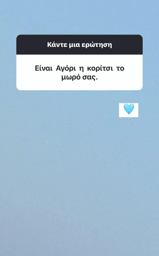 Πιο συγκεκριμένα, όταν διαδικτυακός της φίλος τη ρώτησε αν είναι κορίτσι ή αγόρι, η Ευρυδίκη Παπαδοπούλου απάντησε με μία γαλάζια καρδούλα που μαρτυρά ότι περιμένει αγοράκι.