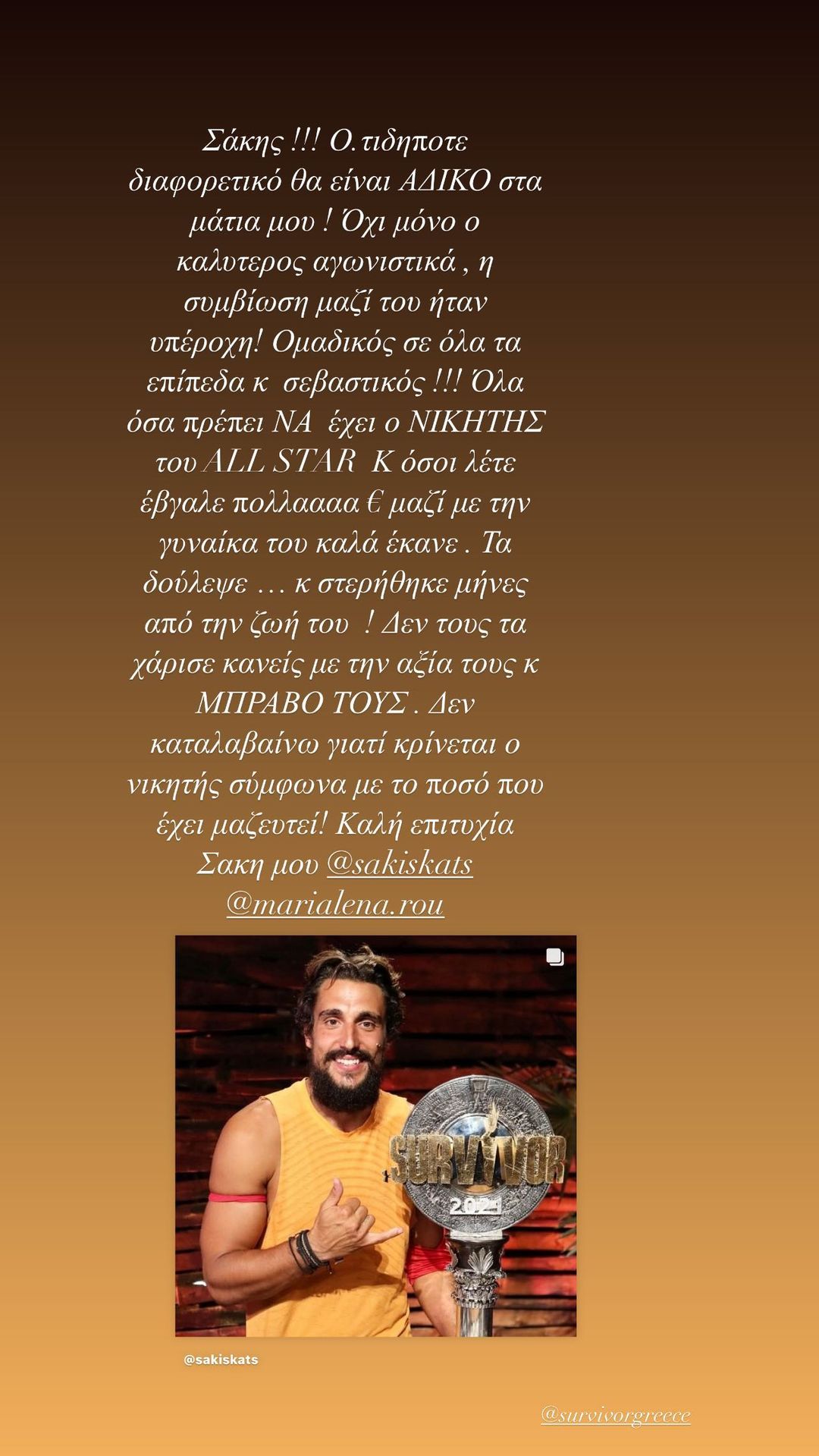 “Σάκης! Ο,τιδήποτε διαφορετικό θα είναι άδικο στα μάτια μου! Όχι μόνο ο καλύτερος αγωνιστικά, η συμβίωση μαζί του ήταν υπέροχη! Ομαδικός σε όλα τα επίπεδα και σεβαστικός!”, γράφει χαρακτηριστικά η Ευρυδίκη Παπαδοπούλου για το Survivor All Star.