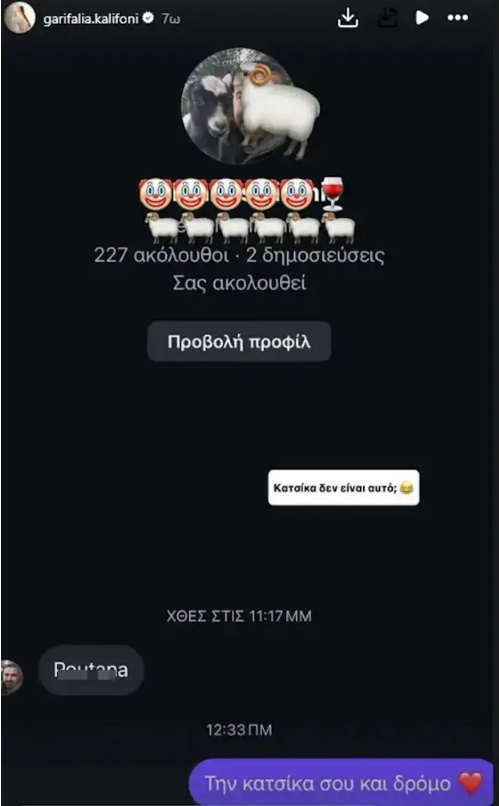 Η Γαρυφαλλιά Καληφώνη έλαβε ένα μήνυμα που έγραφε «πουτ…». Το μήνυμα αυτό την έκανε έξαλλη, γι’ αυτό και αποφάσισε να το κοινοποιήσει στους ακόλουθούς της μαζί με τη δική της απάντηση: «Την κατσίκα σου και δρόμο».