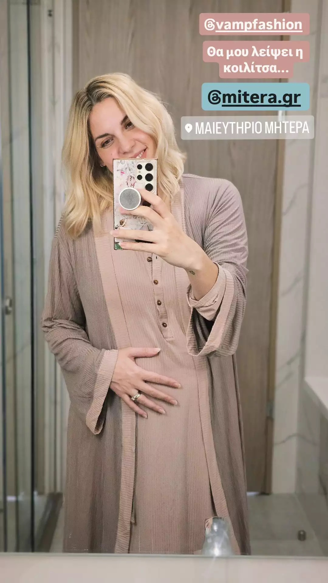 Την ευχάριστη είδηση έκανε γνωστή η ίδια η Μαντώ Γαστεράτου δημοσιεύοντας μια φωτογραφία μέσα από το μαιευτήριο. Στη φωτογραφία αυτή βλέπουμε την ευτυχισμένη μαμά να ποζάρει στον καθρέπτη γράφοντας, «Θα μου λείψει η κοιλίτσα».