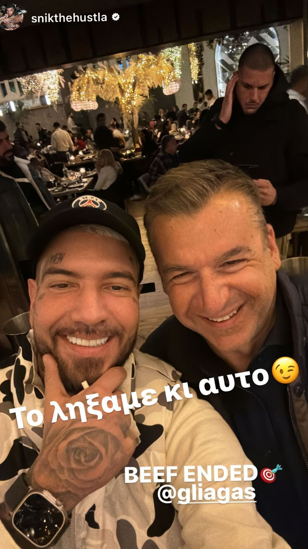 Το βράδυ της Τετάρτης (3/1) Snik και Γιώργος Λιάγκας συναντήθηκαν σε γνωστό μαγαζί και δεν παρέλειψαν να φωτογραφηθούν μαζί, δίνοντας τέλος στη μακροχρόνια… κόντρα ανάμεσά τους. “Το λήξαμε κι αυτό. Beef ended”, έγραψε χαρακτηριστικά ο δημοφιλής τράπερ, ποζάροντας χαμογελαστός με τον παρουσιαστή του ΑΝΤ1.