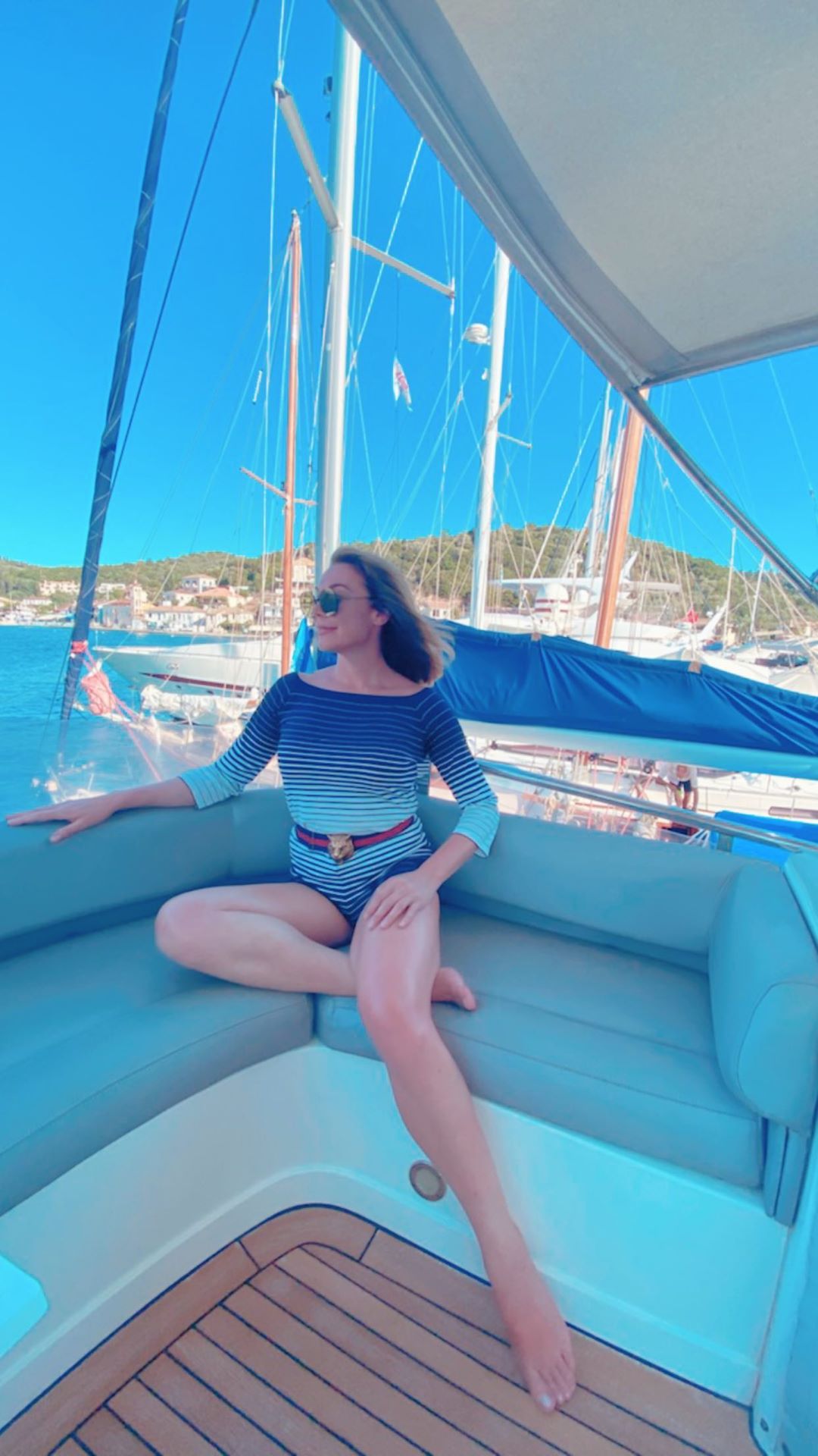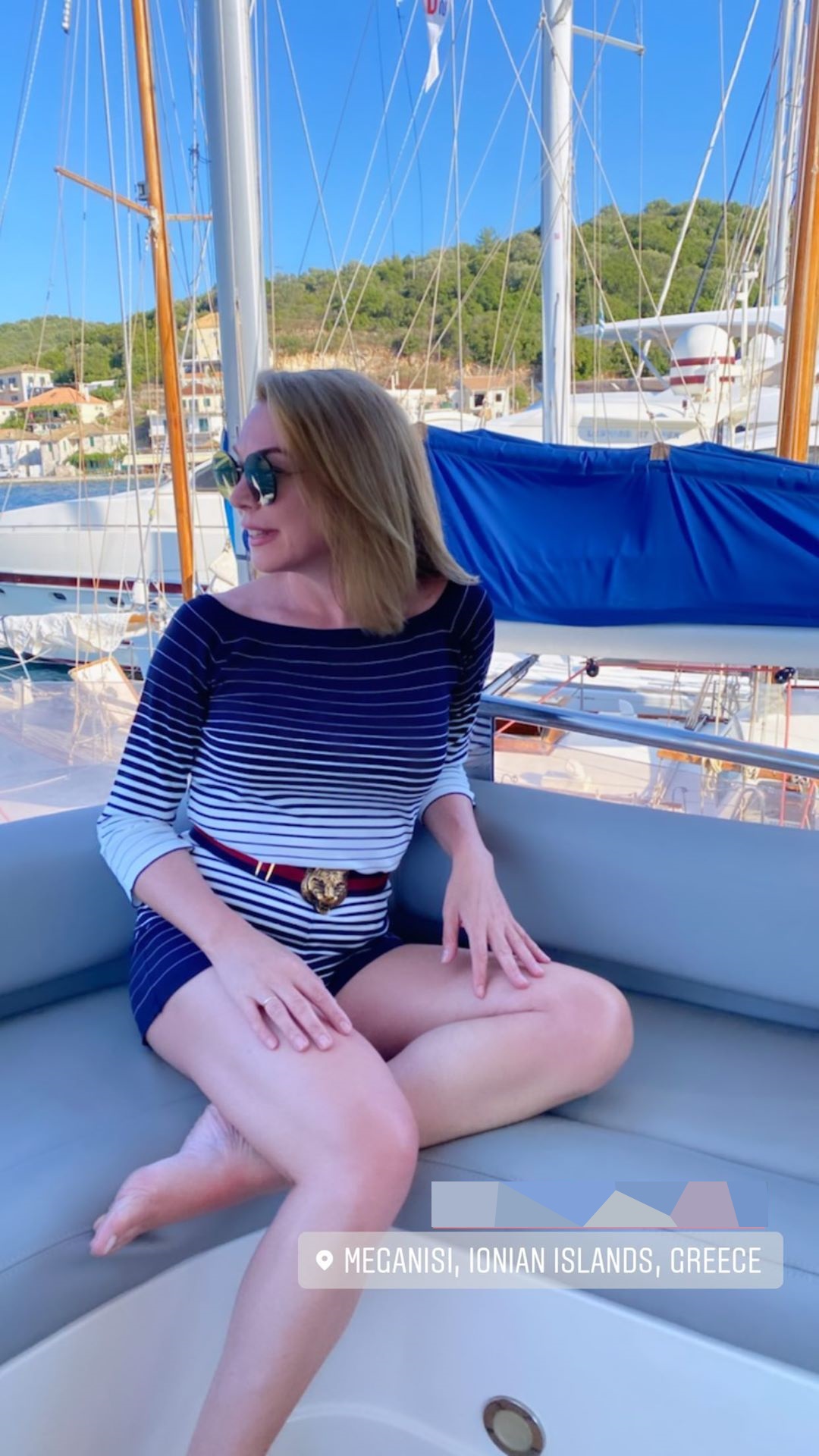 Αφού, λοιπόν, το σκάφος της οικογένειας αγκυροβόλησε στο λιμάνι του νησιού, η παρουσιάστρια φωτογραφήθηκε καθισμένη στο κατάστρωμα, ατενίζοντας από μακριά τις ομορφιές του τόπου, και δημοσίευσε σχετικά στιγμιότυπα στα InstaStories της.